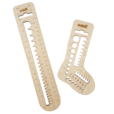 The other gauge is designed as a sock and can be used for both regular round knitting needles and circular needles as well as square knitting needles like Addi Novel. You can measure your round knitting needles from size 1.5 mm to 15 mm and your square knitting needles from size 2.00 mm to 8.00 mm.