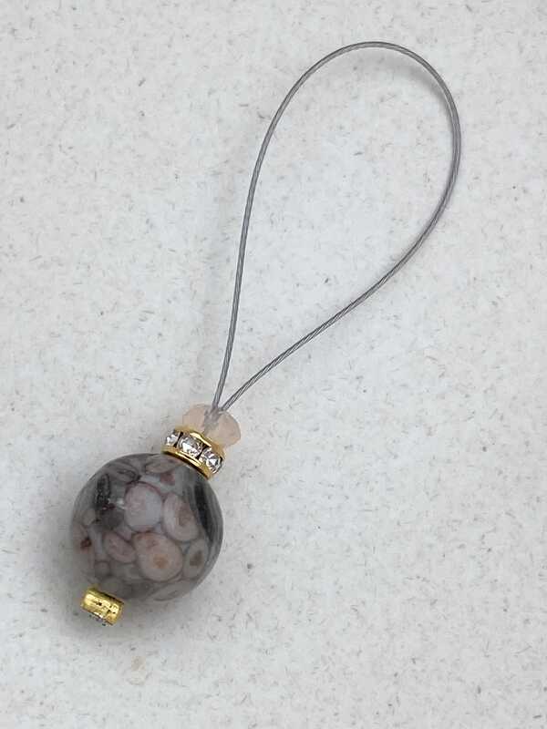 Stitchmarker with a maifinit stone pearl, golden rhinestone rondelle and a champagne coloured facetted glass pearl on a matching wire.