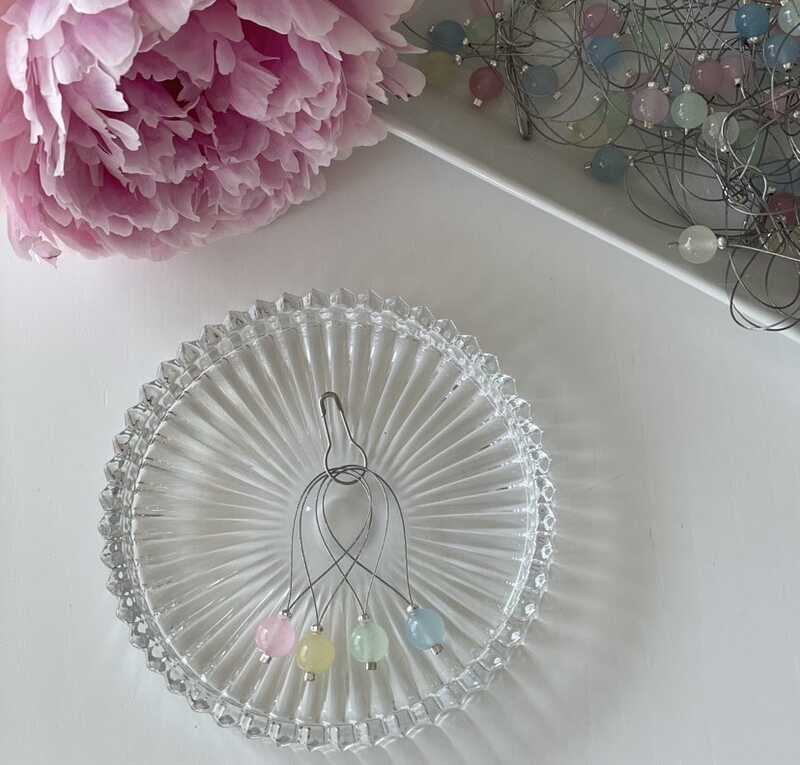 Set of 4 stitchmarkers with various pastel coloured pearls - held together with a steel safety pin.